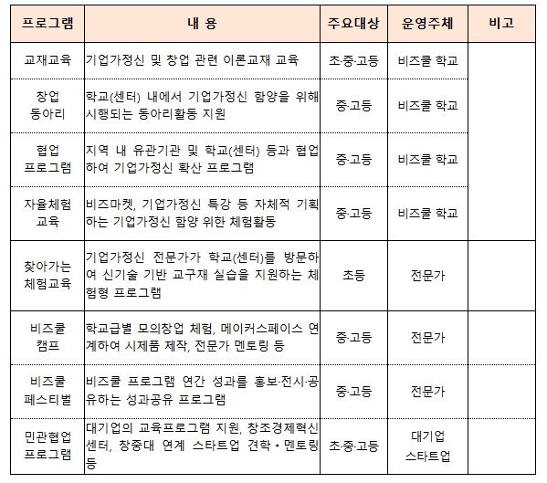 중기부는 2002년부터 400여개 초‧중‧고교를 대상으로 비즈쿨 프로그램을 운영하고 있으며, 청소년들을 대상으로 기업가정신 함양 및 창업 교육을 실시하고, 꿈·도전정신을 갖춘 융합형 창의인재를 양성해왔다.