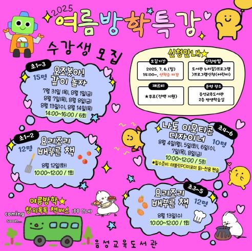 백경미 음성교육도서관 관장은 “이번 여름방학특강은 어린이들이 직접 만들고, 그리고, 탐색하는 과정을 통해 스스로 배움을 확장하는 기회가 될 것”이라며,“디지털과 감성이 어우러지는 창의 프로그램을 통해 도서관이 지역 아동과 주민 모두에게 열린 문화 공간으로 더욱 가까워지길 바란다.”고 전했다.
