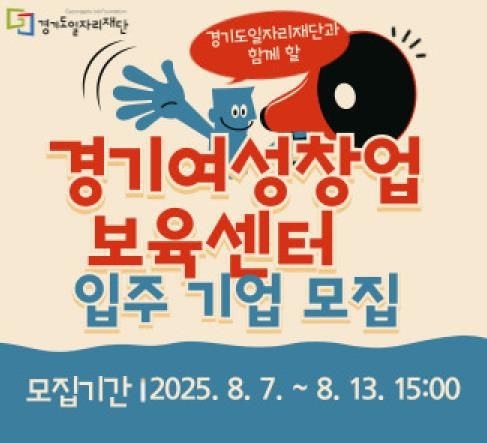 (아름다운교육신문) 경기도일자리재단은 여성 창업 활성화와 유망 여성 창업기업 육성을 위해 ‘2025년 경기도여성창업보육센터 신규 입주기업 모집’ 공고를 지난 1일부터 게시하고 오는 8월 7일부터 8월 13일 오후 3시까지 접수받는다.