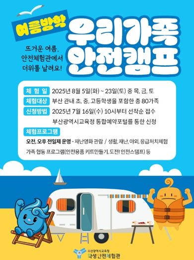 (아름다운교육신문) 부산광역시교육청 학생안전체험관은 여름방학을 맞아 시민 대상으로 ‘가족·일반인 안전체험과 가족안전캠프’를 운영한다고 밝혔다.