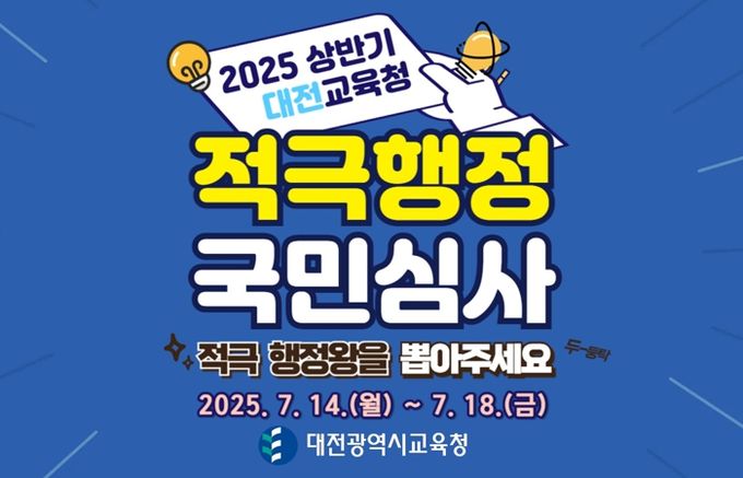 (아름다운교육신문) 대전시교육청은 7월 14일부터 18일까지 2025년 상반기 적극행정 우수사례를 선발하기 위한 온라인 국민심사를 실시한다고 밝혔다.