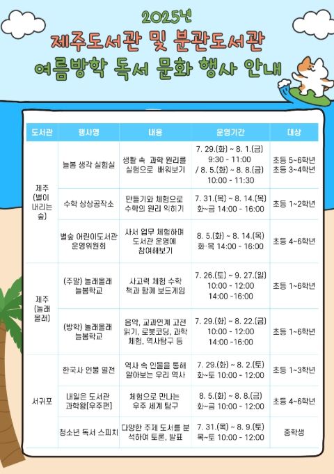 (아름다운교육신문) 제주도교육청 제주도서관은 2025년 여름방학을 맞이하여 어린이와 청소년을 위한 다양한 독서·문화 프로그램을 운영한다고 14일 밝혔다.