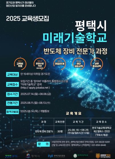 (아름다운교육신문) 평택시는 오는 8월 18일부터 10일간 ‘2025년 평택시 미래기술학교 반도체 장비 전문가 과정’을 운영한다고 밝혔다.
