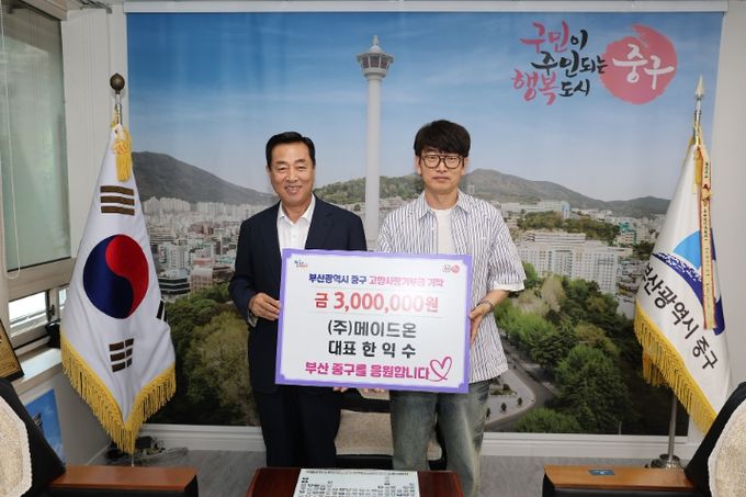 (아름다운교육신문) 부산 중구는 지난 11일 한익수 ㈜메이드온 대표가 고향사랑기부금 300만원을 기탁했다고 밝혔다.