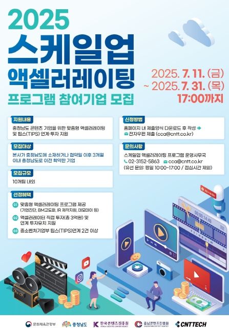(아름다운교육신문) 충남콘텐츠진흥원은 도내 콘텐츠 기업의 성장 기반 마련을 위한 '2025 스케일업 액셀러레이팅 프로그램' 참가 기업을 오는 31일까지 모집한다고 밝혔다.