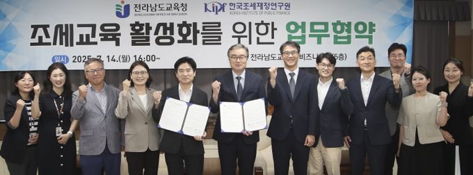 전라남도교육청과 한국조세재정연구원은 7월 14일 청사 비즈니스실에서 ‘조세교육 활성화를 위한 업무협약’을 체결하고 전남 학생들이 교실 안에서 조세의 개념을 쉽게 이해하고 실천적으로 배우는 교육 기반을 구축해 나가기로 했다.