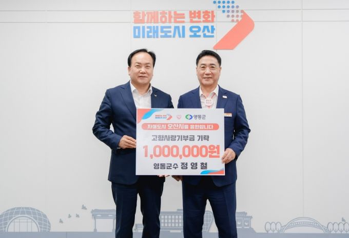 (아름다운교육신문) 정영철 영동군수는 14일 자매도시인 경기도 오산시청을 방문하여 고향사랑기부에 동참하며, 지역 간 상생과 교류 확대에 대한 의지를 다시 한 번 강조했다.