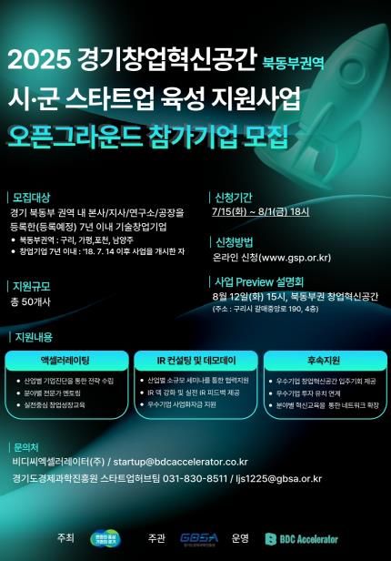이 프로그램은 구리시에 위치한 북동부권 경기창업혁신공간에서 진행되며, 선발된 기업은 ▲1:1 맞춤형 멘토링 ▲기초·심화 역량강화 교육 ▲산업별 세미나 ▲IR 컨설팅 ▲투자 연계 등을 지원받을 수 있다.