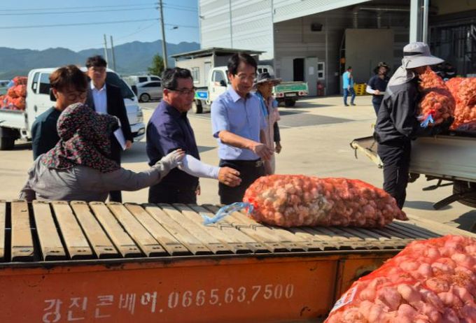 (아름다운교육신문) 강진원 강진군수가 마늘 수매가 한창인 지난 9일 강진한들농협 마늘 수매 현장을 찾아 무더운 날씨에도 불구하고 농산물 판매에 애쓰는 농민들을 격려하고 실질적인 지원방안을 모색했다.