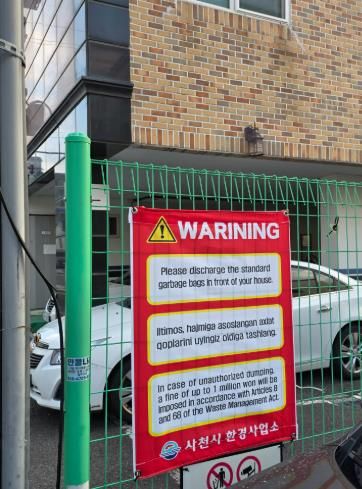 사천시는 관내 외국인 주민의 쓰레기 분리배출 인식 개선과 불법투기 예방을 위해 외국인 밀집 거주지역인 사천읍에 영어·우즈벡어 등 2개 국어로 표기한 현수막을 설치했다고 15일 밝혔다.