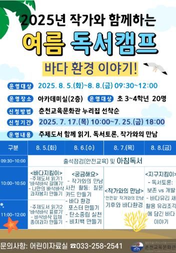 이번 여름 독서캠프는 ‘바다 환경 이야기’를 주제로 해양 오염, 생태환경에 관한 그림책을 읽고, 작가와의 만남을 진행할 예정이다.