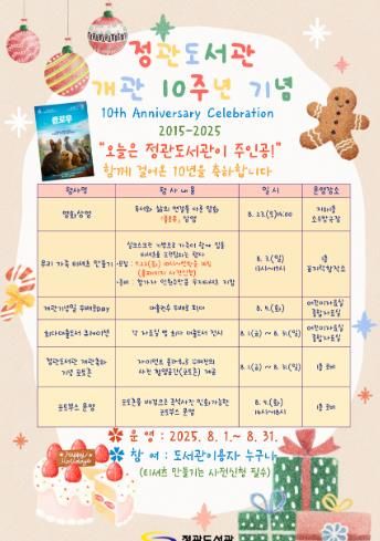(아름다운교육신문) 기장군은 정관도서관 개관 10주년을 맞아, 오는 8월 한 달간 다채로운 기념행사를 진행한다고 15일 밝혔다.