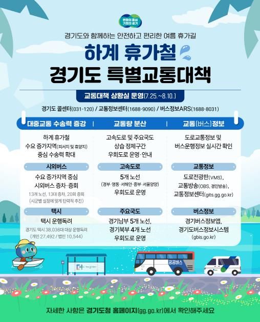 윤태완 경기도 광역교통정책과장은 “휴가 기간 도민과 관광객들의 안전하고 편리한 이동을 위해 최선을 다하겠다”며 “도민분들도 교통법규를 준수하며 안전운전에 동참해주시길 당부드린다”고 말했다.