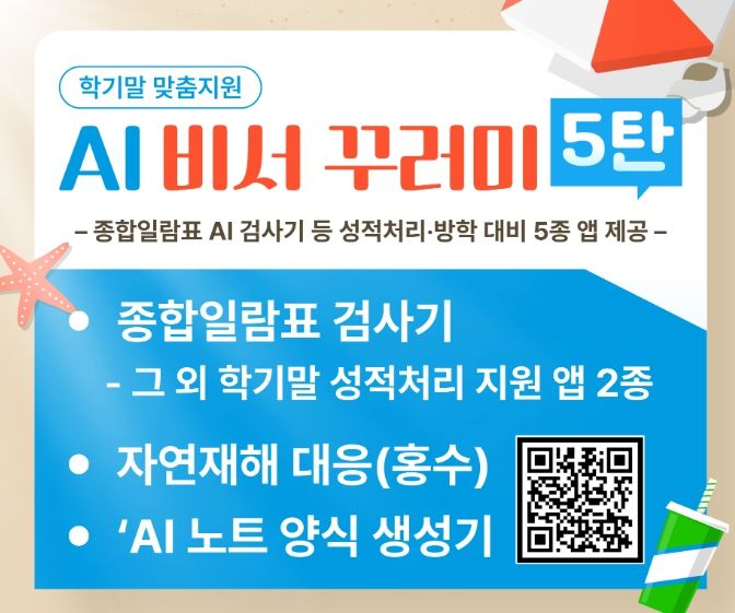 (아름다운교육신문) 경북교육청은 학기 말 성적 처리와 방학 대비 업무를 인공지능으로 지원하는 웹앱 패키지 ‘AI 비서 꾸러미 5탄(학기 말 맞춤 지원 꾸러미)’을 전국 최초로 개발해 보급했다고 16일 밝혔다.