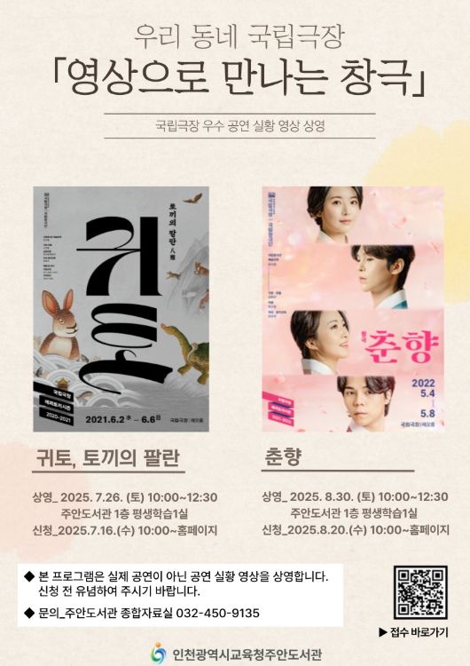 (아름다운교육신문) 인천광역시교육청주안도서관은 국립극장의 우수 창극 공연 실황을 영상으로 감상하는 ‘우리 동네 국립극장 – 영상으로 만나는 창극’ 프로그램을 운영한다.