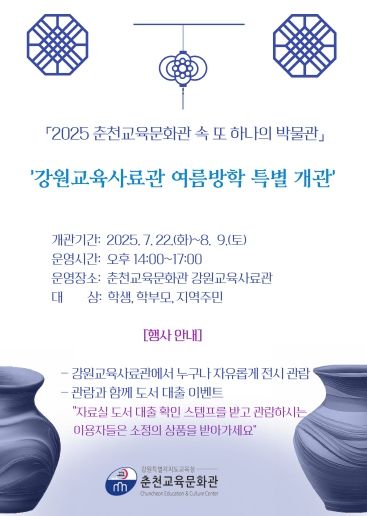 이번 행사는 ‘춘천교육문화관 속 또 하나의 박물관’인 강원교육사료관을 여름방학 동안 오후 2시부터 오후 5시까지 한시적으로 개방 운영한다.