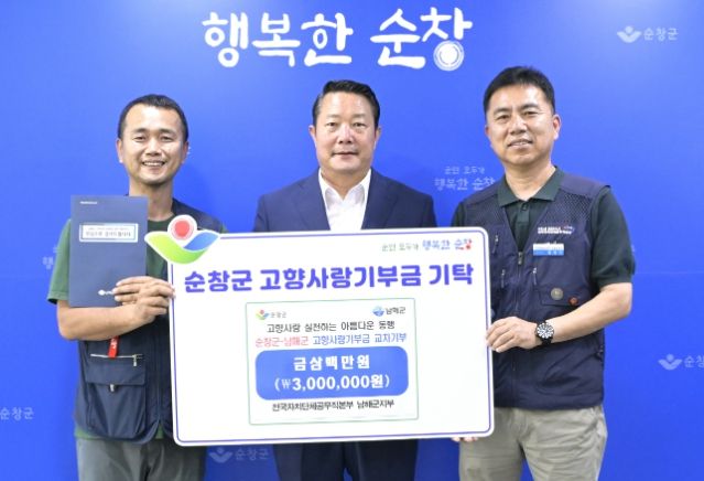 (아름다운교육신문) 순창군은 16일 전국자치단체 공무직본부 소속 순창군지부(지부장 홍영기)와 남해군지부(지부장 이장근)가 양 지자체 간 우호 교류 증진과 상생 발전을 위해 고향사랑기부금을 각각 300만 원씩 상호 기부했다고 밝혔다.