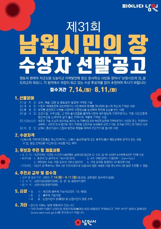 최경식 남원시장은 “시민 여러분의 작은 관심과 적극적인 추천이 숨은 영웅들을 발굴하고 그분들이 헌신에 합당한 예우를 표하는 데 큰 힘이 될 것”이라며 “시민의 장 추천에 많은 분들이 동참하여 남원의 아름다운 가치를 함께 빛내 주시기를 당부드린다”고 말했다.