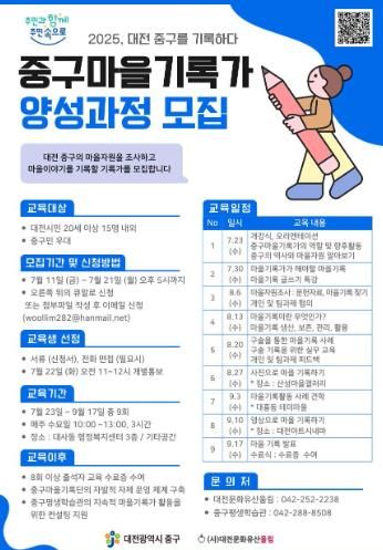 (아름다운교육신문) 대전 중구는 마을의 과거와 현재, 미래 이야기를 주민 스스로 기록하는 ‘중구 마을기록가 양성과정’ 참가자를 모집한다고 16일 밝혔다.