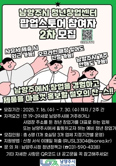 남양주시 청년창업센터 팝업스토어 참여자 2차 모집 관련 기타 자세한 사항은 시 홈페이지 모집공고를 확인하거나 청년정책과 청년지원팀으로 문의하면 된다.