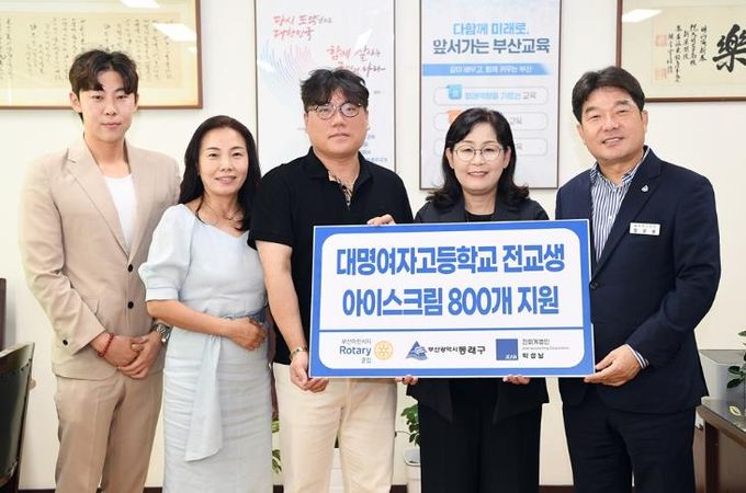 (아름다운교육신문) 부산 동래구는 지난 14일 부산마린시티로타리클럽이 동래구 소재 대명여자고등학교 재학생 2명에게 상·하반기로 나누어 1인당 연 60만원의 장학금을 지원하고, 전교생이 무더운 여름을 날 수 있도록 아이스크림 800개를 지원했다고 밝혔다.