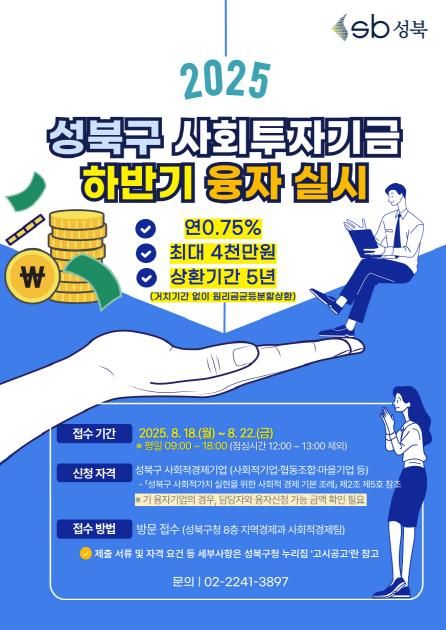 하반기 융자 신청은 오는 8월 18일부터 22일까지 5일간 진행된다. 신청을 원하는 기업은 성북구청 누리집 고시공고란을 참고해 기간 내 성북구청 8층 지역경제과에 방문 접수하면 된다. 이후 서류심사, 현장실사, 위원회 심사 등 3단계 절차를 거쳐 선정 여부와 지원 금액이 결정된다.