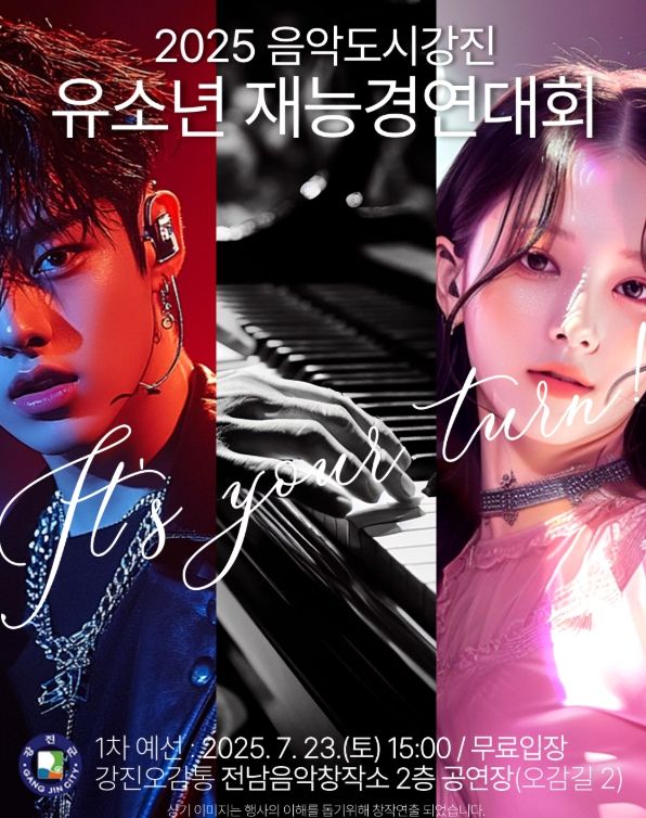 (아름다운교육신문) 음악도시 강진군이 노래, 춤, 연주 등 음악 분야에 재능을 가진 미래창의인재 의 성장을 지원하고 3대가 함께 즐기는 강진문화예술을 활성화하기 위해 추진하는 유소년 재능경연대회 1차 예선이 오는 23일 오후 3시 강진오감통 전남음악창작소(오감길 2) 2층 공연장에서 열린다.