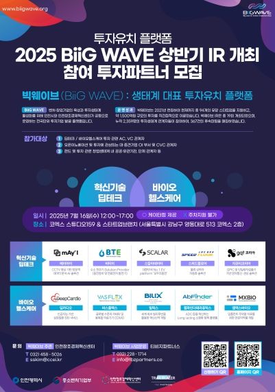 한편, 오는 9월 23일 ‘오픈 이노베이션’을 주제로 5개 스타트업이 참여하는‘2차 빅웨이브 투자유치 설명회(IR)’가 인천 송도컨벤시아에서‘인천스타트업위크 SURF 2025’행사와 함께 개최될 예정이다.