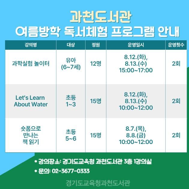 (아름다운교육신문) 경기도교육청과천도서관이 관내 유아(6~7세) 및 초등학생을 대상으로 ‘여름방학 독서체험 프로그램’을 운영한다.