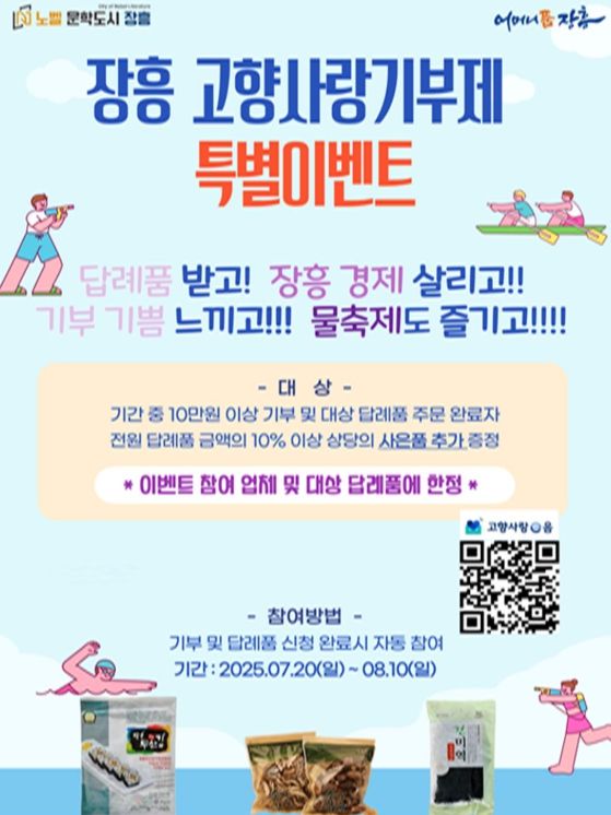 기간 중 장흥군에 고향사랑기부 후 답례품을 주문한 사람을 대상으로 구매금액의 10%에 해당하는 특산품이 추가로 증정된다.