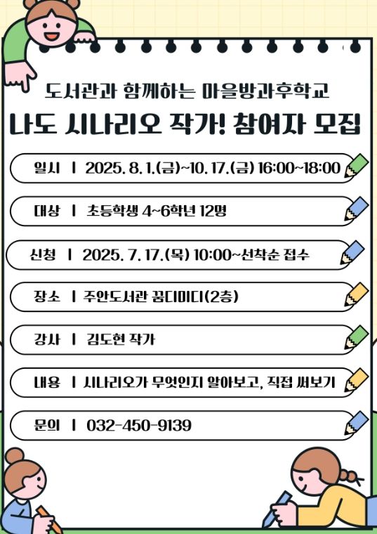 (아름다운교육신문) 인천광역시교육청주안도서관은 8월 1일부터 10월 17일까지 초등학교 고학년을 대상으로 마을방과후학교 프로그램 ‘나도 시나리오 작가’를 운영한다.