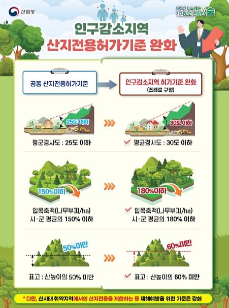 먼저, 평균 경사도는 인구감소지역은 기존 25도 이하에서 30도 이하인구감소외 지역은 27.5도 이하로 완화되고 산림 내 나무 부피를 나타내는 입목축적기준은 시군 평균의 150% 이하에서 인구감소지역 180% 이하, 감소외지역은 165% 이하로 완화된다.