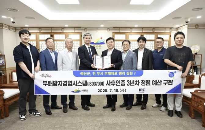 최재구 군수는 “이번 인증 유지 성공은 군민과 모든 이해관계자에게 신뢰받는 지방정부로 거듭나기 위한 예산군의 강력한 의지를 보여주는 것”이라며 “앞으로도 부패 방지를 위한 노력을 지속해 9년 연속 청렴도 우수기관 달성을 목표로 세우고 부패방지경영시스템이 모든 행정기관으로 확산될 수 있도록 선도적 역할을 담당하겠다”고 말했다.