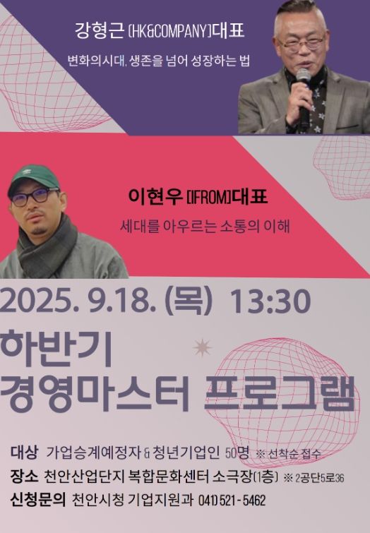 (아름다운교육신문) 천안시는 9월 18일 천안산업단지 복합문화센터에서 열리는 ‘하반기 경영마스터 프로그램’ 참여자를 모집한다고 18일 밝혔다.
