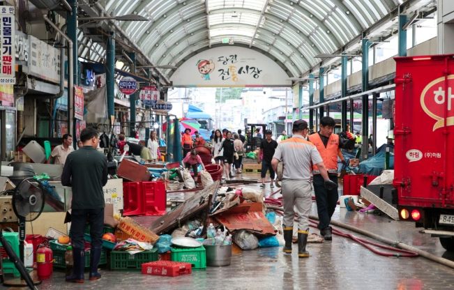 특히, 피해가 가장 컸던 전통시장에는 지난 17일부터 공무원, 경찰, 소방서, 자율방재단 등 1300명이 현장에 투입돼 폐기물을 처리하고 있으며, 양수기와 펌프차량을 동원한 응급 복구를 통해 복구율은 약 65%로 집계됐다.