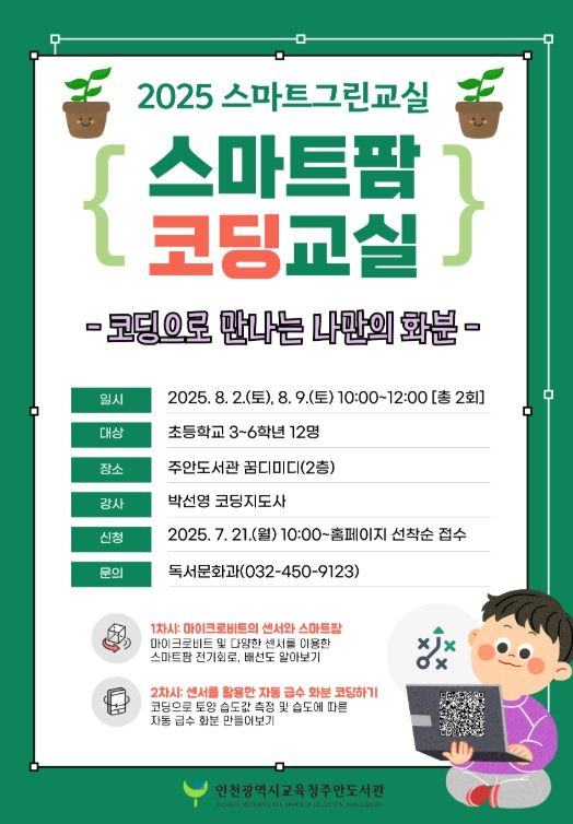 (아름다운교육신문) 인천광역시교육청주안도서관은 여름방학을 맞아 8월 2일과 9일 초등학교 3~6학년 학생을 대상으로 ‘스마트팜 코딩교실 '코딩으로 만나는 나만의 화분'’을 운영한다.