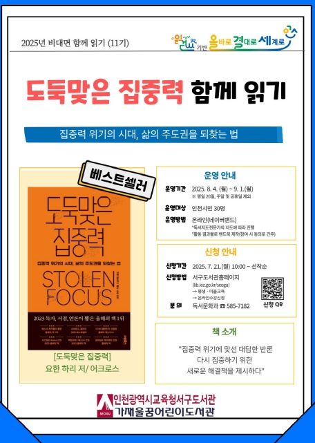 (아름다운교육신문) 인천광역시교육청서구도서관은 ‘비대면 함께읽기’ 11기 프로그램으로 ‘도둑맞은 집중력’을 선정하고, 8월 4일부터 9월 1일까지 운영한다.