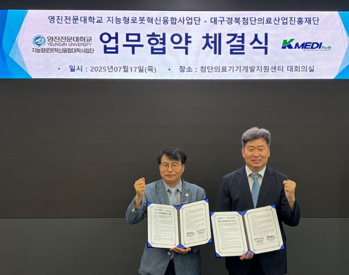 (아름다운교육신문) 케이메디허브 첨단의료기기개발지원센터가 지난 17일 영진전문대학교 지능형로봇혁신융합대학사업단과 업무협약을 체결했다.