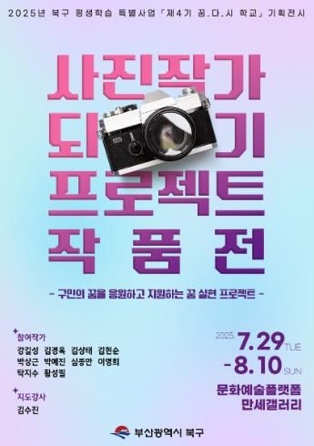 (아름다운교육신문) 부산 북구는 구민의 꿈을 지원하는 ‘꿈 실현 프로젝트’의 일환으로 추진한 ‘꿈.다.시. 학교 – 사진작가 되기 프로젝트’ 프로그램의 결과물을 선보이는 사진 전시회를 개최한다.