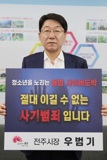 (아름다운교육신문) 우범기 전주시장이 18일 불법 사이버도박의 위험성을 알리고 청소년이 건강하게 성장하기 위한 환경을 조성하기 위한 청소년 불법 사이버도박 근절 캠페인에 동참했다.