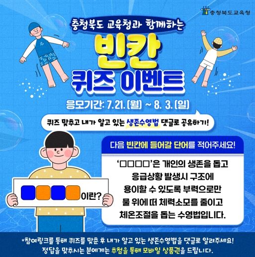 먼저, 여름철 물놀이 안전사고 예방 이벤트는 물에 대한 적응력 향상 및 위기 상황 시 자기 생명 보호 능력 강화를 목표로 운영하는 생존수영 교육과 관련한 빈칸 퀴즈로 진행한다.