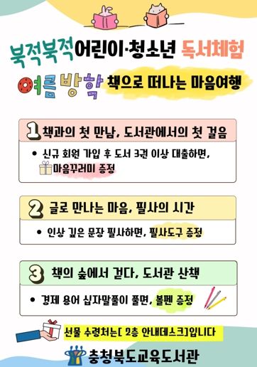 (아름다운교육신문) 충청북도교육청 직속기관 교육도서관은 여름방학을 맞아 2025. 여름방학 북적북적 어린이·청소년 독서체험을 운영한다고 밝혔다.