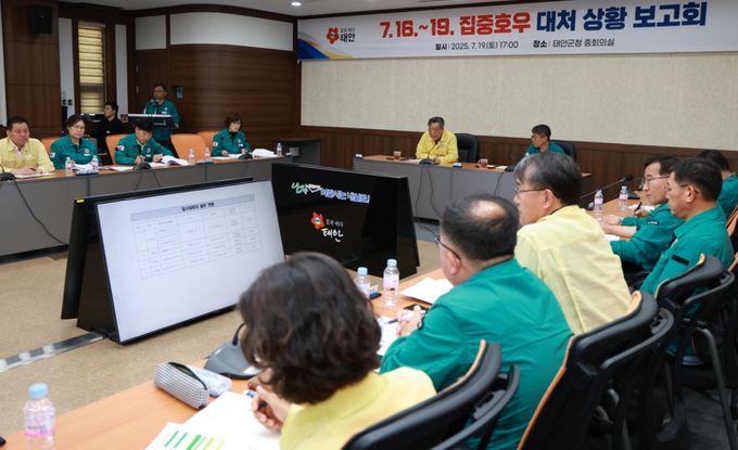 태안군은 토요일인 19일 군청 중회의실에서 가세로 군수를 비롯해 부군수와 실·국장, 부서장, 각 읍면장 등 40여 명이 참석한 가운데 ‘7. 16.~19. 집중호우 대처상황 보고회’를 갖고 부서별 대응상황을 점검했다고 밝혔다.