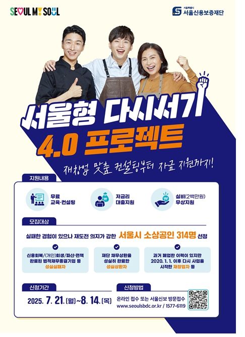 (아름다운교육신문) 서울시와 서울신용보증재단은 소상공인의 재기를 돕는 ‘서울형 다시서기 4.0 프로젝트’를 오는 21일부터 본격 추진한다.