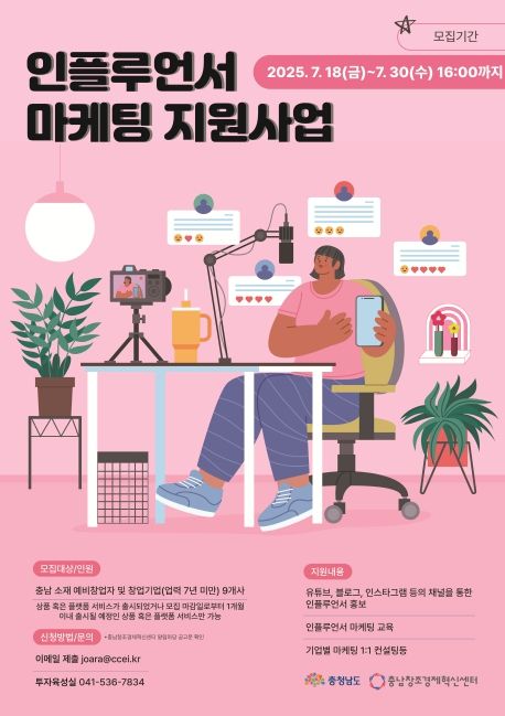 (아름다운교육신문) (재)충남창조경제혁신센터는 도내 창업기업의 온라인 홍보 역량 강화를 위해 ‘2025년 인플루언서 마케팅 지원사업’을 추진하며, 오는 7월 30일까지 참여기업을 모집한다고 밝혔다.