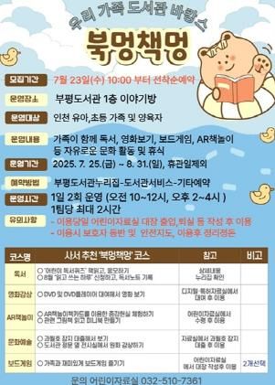 (아름다운교육신문) 인천광역시교육청부평도서관은 여름방학을 맞아 유아‧초등 가족 대상 ‘우리 가족 도서관 바캉스 북멍책멍’ 프로그램을 운영한다.
