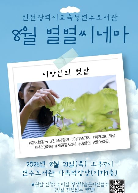 (아름다운교육신문) 인천광역시교육청연수도서관은 8월 ‘별별씨네마’에서 김이향 감독의 다큐멘터리 영화 ‘이방인의 텃밭’을 상영한다.