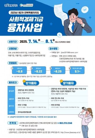 도는 2025년 제2차 사회적경제기금 융자사업을 통해 전북에 소재한 예비사회적기업, (사회적)협동조합, 마을기업, 자활기업, 소셜벤처기업 등을 대상으로 자금을 지원할 계획이다. 신청 접수는 8월 1일까지이며, 서류심사 및 현장실사를 거쳐 8월 말 최종 지원 대상 기업을 선정한다.