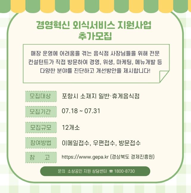 (아름다운교육신문) 포항시는 지역 외식업소의 경쟁력 강화를 위한 ‘2025년 경영혁신 외식서비스 지원사업’을 추진하며 오는 7월 31일까지 2차 참여업소를 모집한다고 밝혔다.