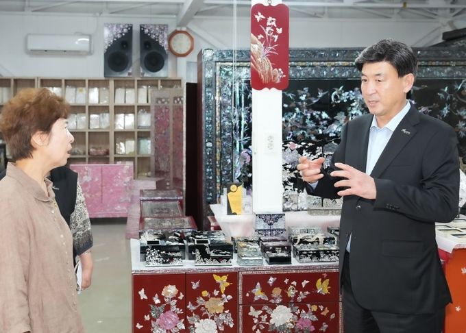 이날 첫 번째로 방문한 진주쉘은 3대에 걸쳐 전통 자개 문화를 계승·발전시켜온 업체로 전통 나전칠기 기법과 현대적 디자인을 접목한 제품을 통해 국내외 시장에서 주목받고 있는 기업이다.
